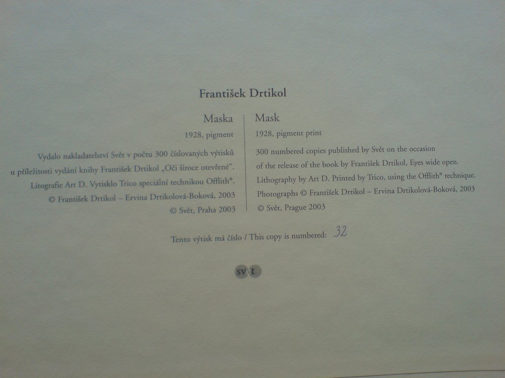 pamětní tisk vydaný u příležitosti vydání knihy František Drtikol "Oči široce otevřené" v limitovaném počtu 300 číslovaných výtisků.