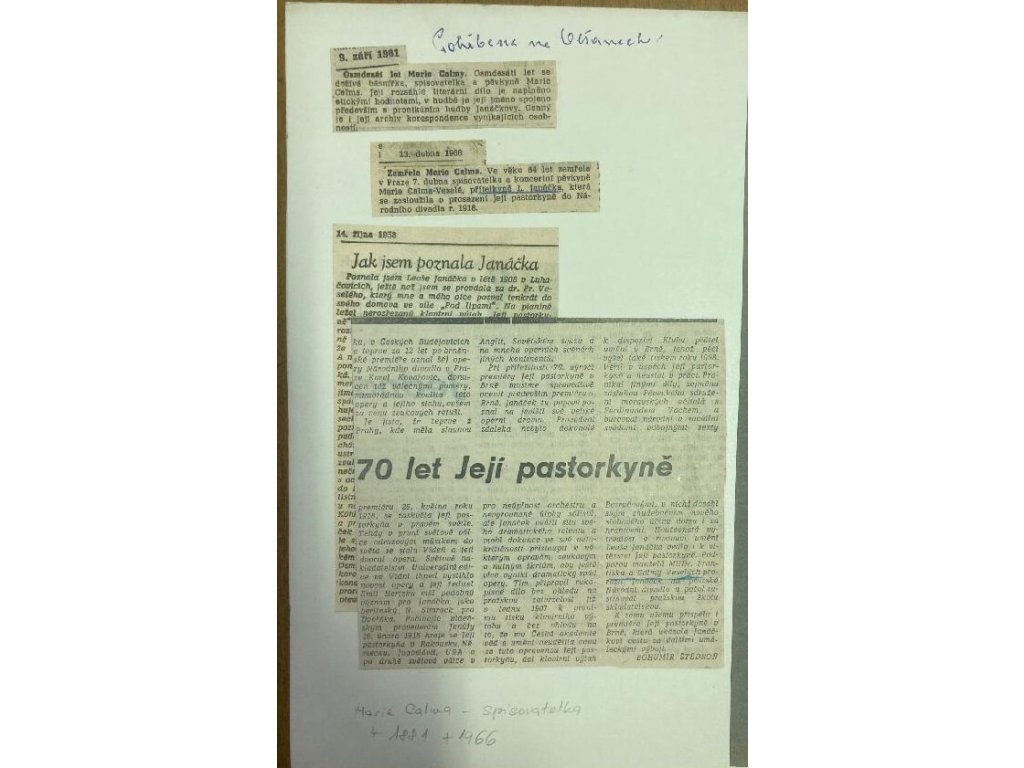 původní originální oficiálně vydaná podepsaná fotopohlednice básnířky, spisovatelky a pěvkyně Marie Calmy, foto je komponováno na původní paspartus věnováním z roku 1943.vzadu na pasprtě nalepeny novinové články o jejím úmrtí...
