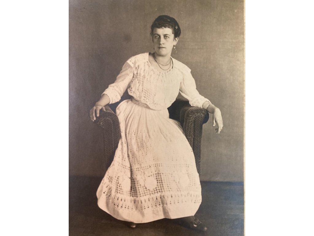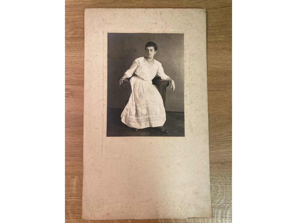původní originální bromostříbrná fotografie dámy v křesle na původní originální paspartě